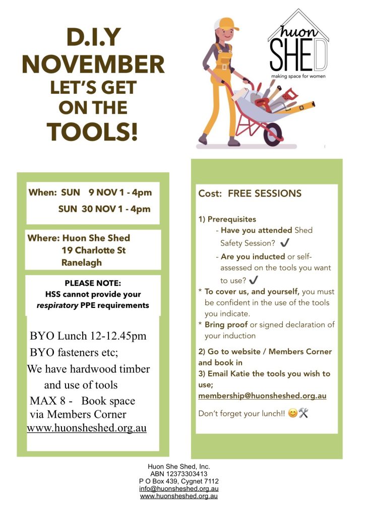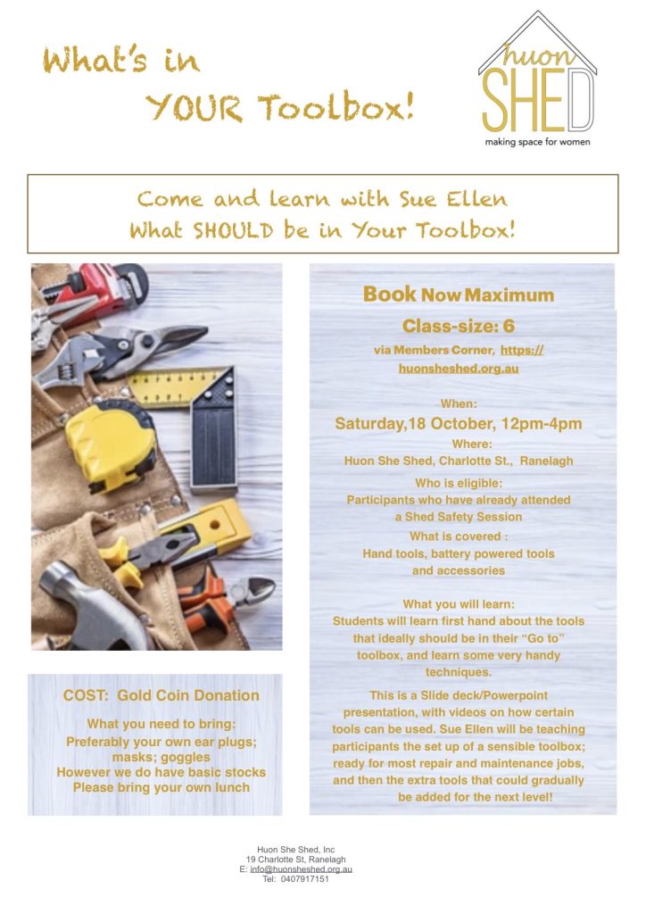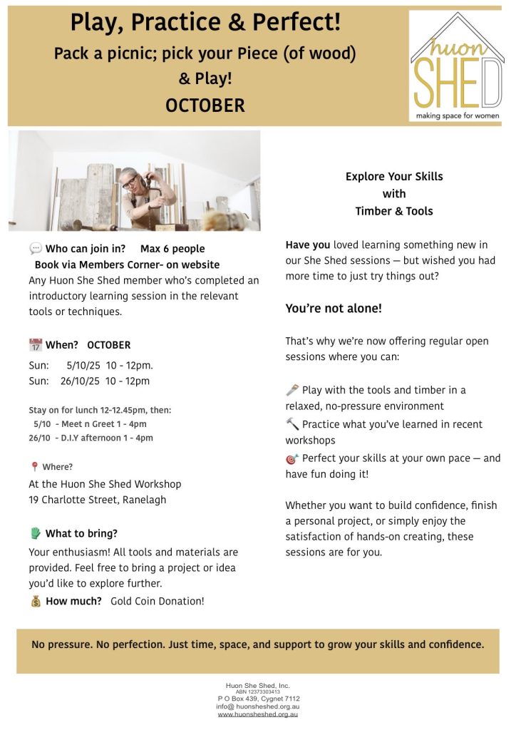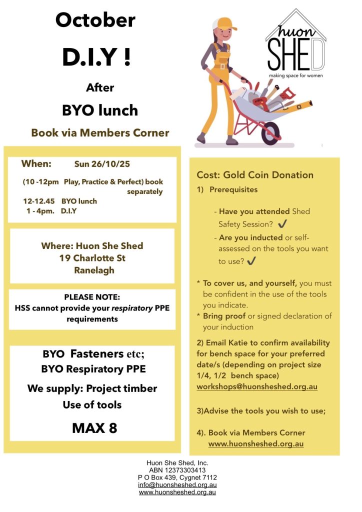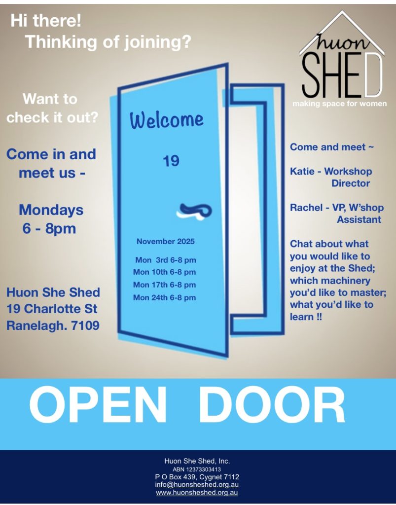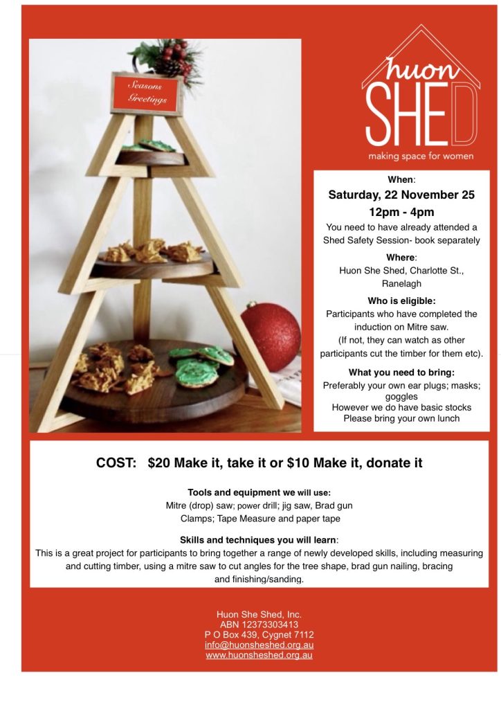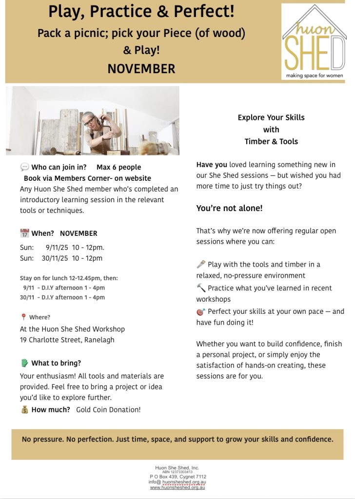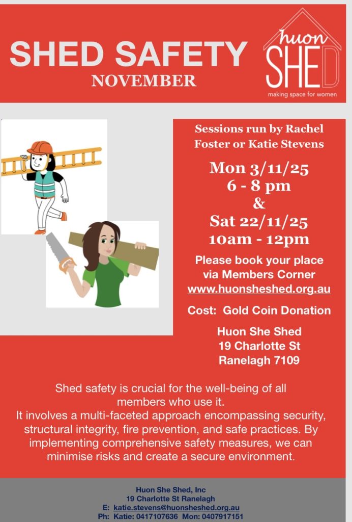 The Huon She Shed Inc. is a non-profit organisation that aims to provide a safe, inclusive environment for woman of all ages, backgrounds, identities and capabilities where they can gather and learn basic building, metal working and wood working skills.